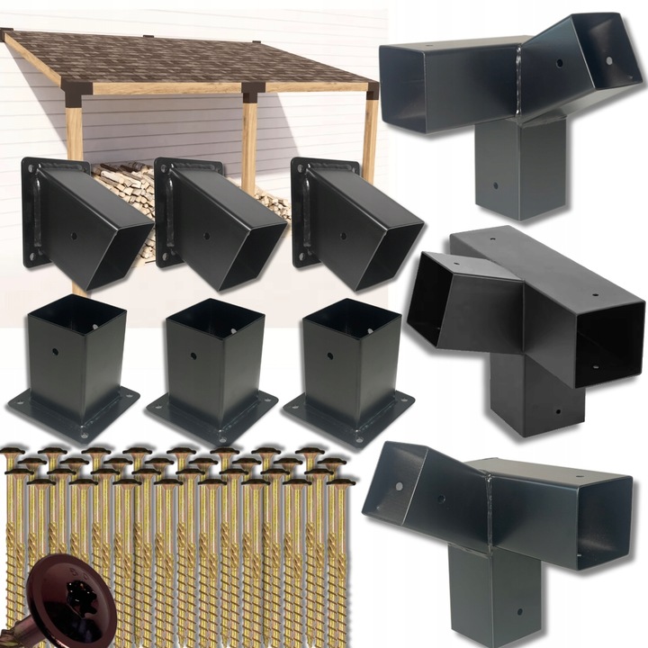 Zestaw łączników do montażu wiaty. Dzięki solidnej konstrukcji i precyzyjnemu wykonaniu, nasze łączniki zapewniają stabilność i estetykę każdej drewnianej konstrukcji, jednocześnie są proste i szybkie w montażu.