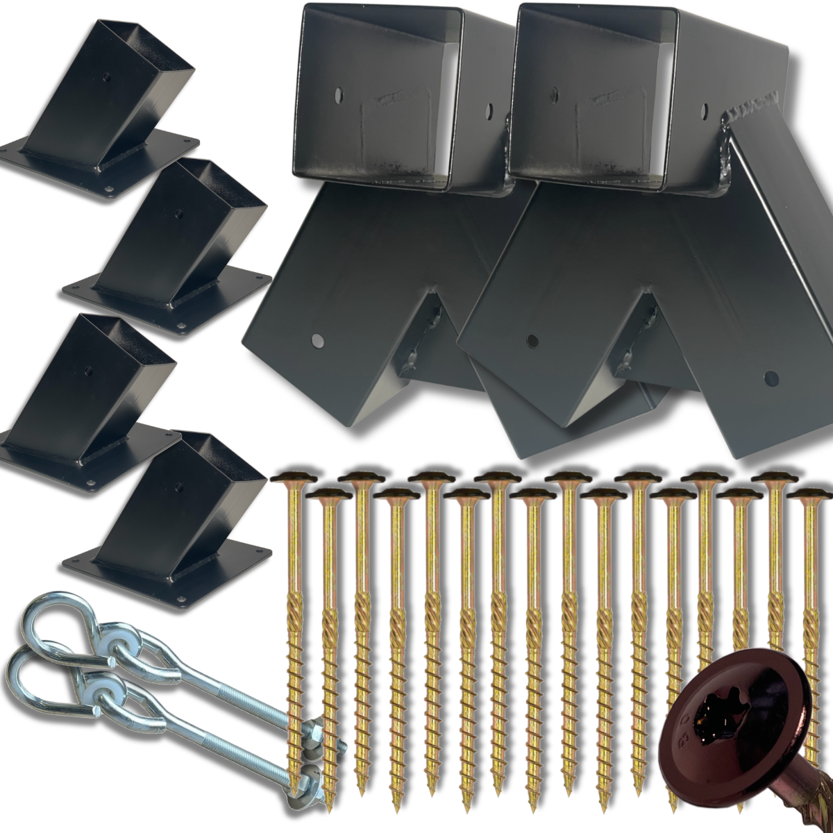 Zestaw łączników do montażu huśtawki ogrodowej. Dzięki solidnej konstrukcji i precyzyjnemu wykonaniu, nasze łączniki zapewniają stabilność i estetykę każdej drewnianej konstrukcji, jednocześnie są proste i szybkie w montażu.
